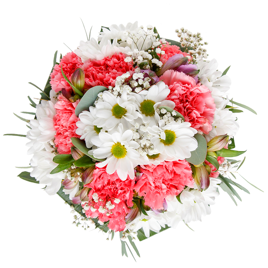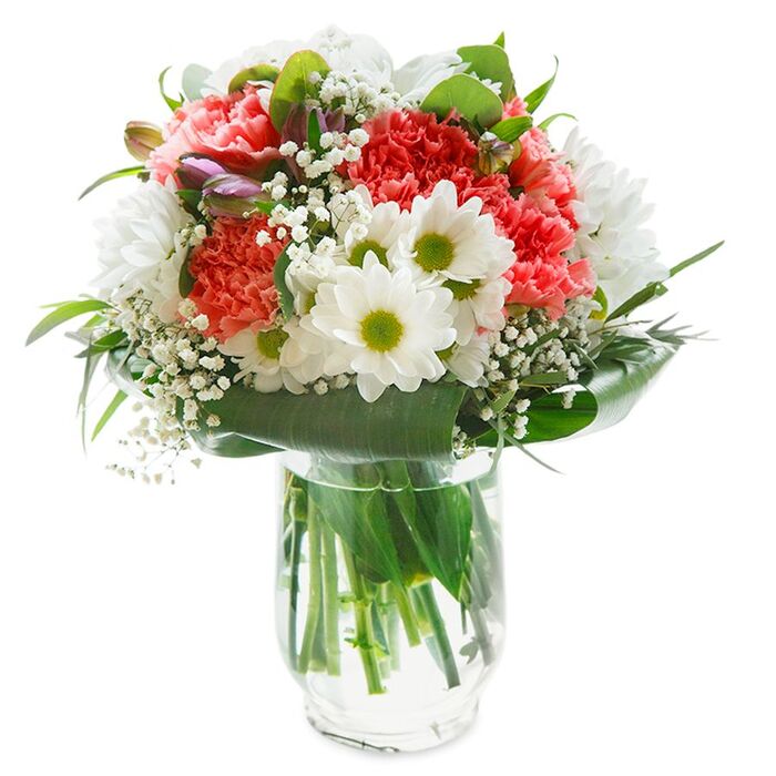 Indulge in the refined beauty of our white-pink flower arrangement. This sophisticated bouquet features snow-white chrysanthemums, graceful gypsophila, and light pink carnations, meticulously arranged with lush aspidistra leaves for a stunning and unique presentation.